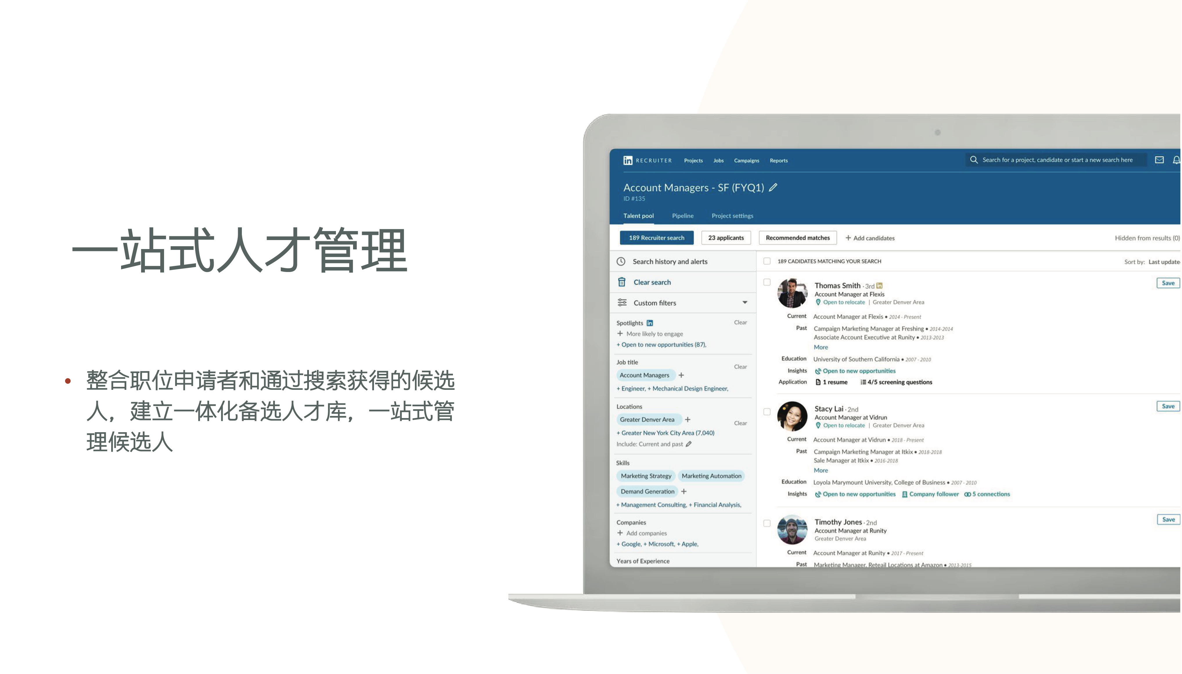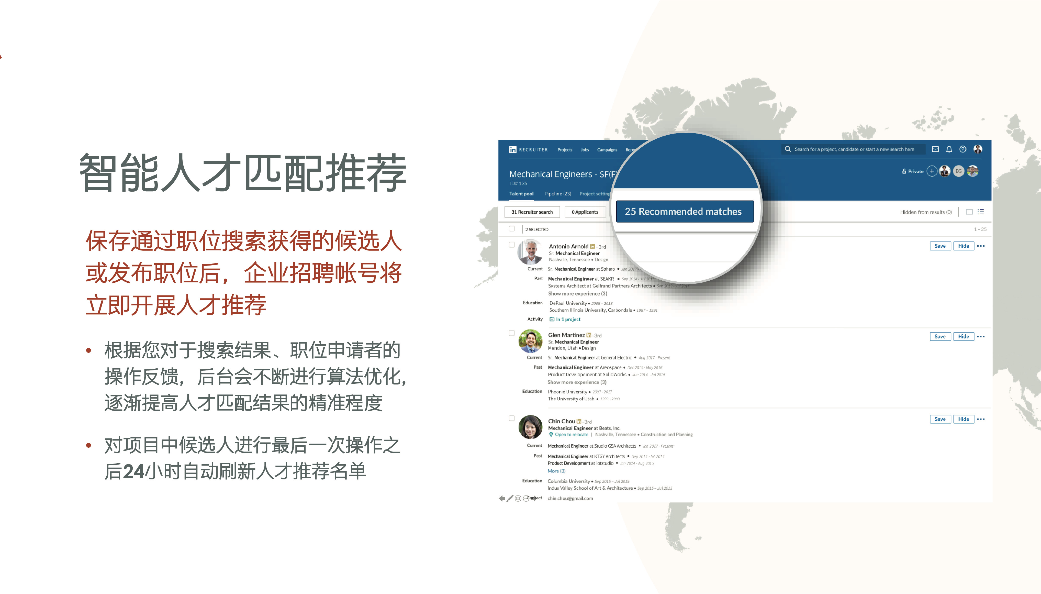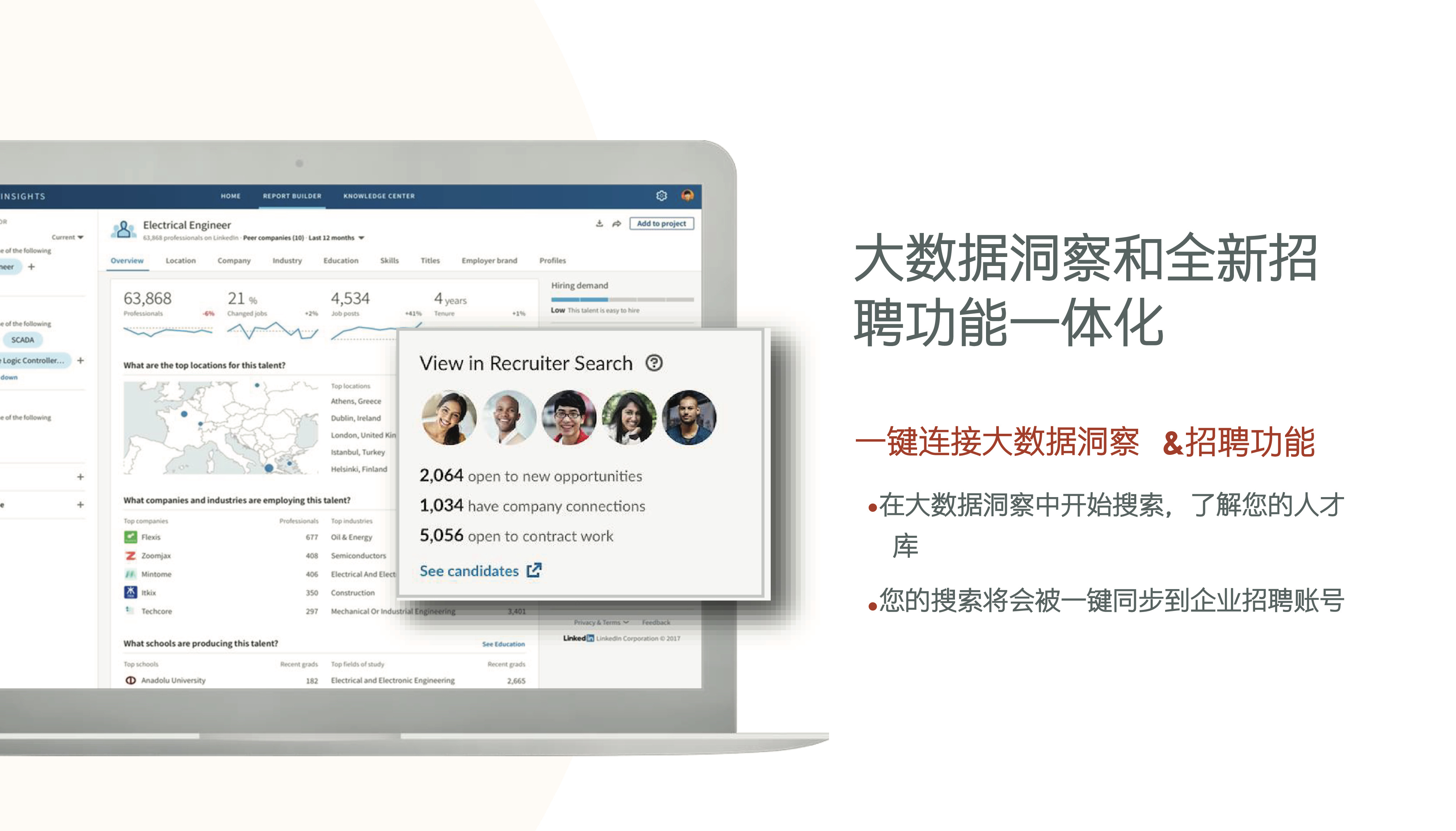 領英人才解決方案于2014年落地中國,在本地化發展上已經獲得諸多成果。在產品層面,領英人才解決方案中國團隊把全球產品結合國內的應用場景進行了本土深化。中國團隊基于客戶的使用狀況發展了數十個更貼近中國企業客戶的應用場景,已經服務多家中國企業。中國企業客戶在搜索人才的時候,可以一鍵搜索擁有海外經歷的候選人,這也是針對中國客戶定制的應用。 針對中國客戶的需求,中國團隊提供全面、定制化的服務。針對中國客戶對工作效率要求非常高的特點,領英中國設立了專門的2B 客戶虛擬電話。此外,領英為中國客戶提供線上和線下培訓,向企業提供定制化一對一培訓,讓更多客戶分享交流經驗,提升中國客戶使用能效。領英人才解決方案中國團隊每年發布數份重磅數據報告,為企業提供人才趨勢和行業勞動力洞察,領英行業大數據報告已被瀏覽超過10萬次。 目前領英在中國有5400萬會員,有35.9萬公司在領英開設公司主頁。領英人才解決方案在中國服務的多為國內企業,以互聯網、IT、高科技智能制造、金融、房地產、傳統制造行業為主。未來,領英將繼續推動旗下產品的迭代和整合,將更多領先的人才管理理念和智能化產品帶到中國市場。